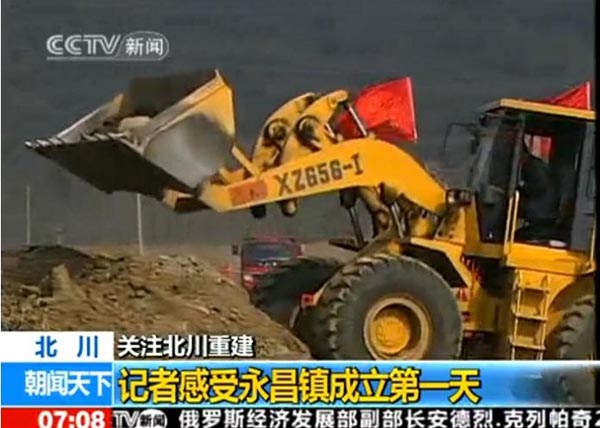 2010年2月3日早7:08分,央視新聞頻道的朝聞天下欄目,播出了汶川地震后第一個異地重建的新縣城---北川縣城所在地永昌鎮(zhèn)黨委、政府正式掛牌成立的報道,目前,北川的各項工程建設(shè)正在如火如荼的進(jìn)行中,其中在央視的報道中,廈裝XZ656-Ⅰ裝載機(jī)正在繁忙的作業(yè)中。據(jù)了解,我司的裝載機(jī)在汶川地震后的重建中發(fā)揮了重要作用。